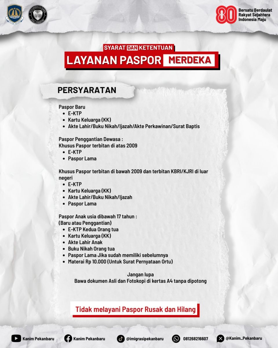 GAGASANRIAU.COM, PEKANBARU - Dengan semangat memperingati Hari Ulang Tahun ke-80 Kemerdekaan Republik Indonesia, Kantor Imigrasi Kelas I TPI Pekanbaru menghadirkan Layanan Paspor Merdeka di Mall Ciputra Seraya Pekanbaru pada tanggal 23–24 Agustus 2025.