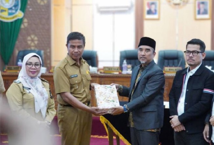 Bupati Ahmad Yuzar yang hadir didampingi Wakil Bupati Dr. Hj. Misharti, S.Ag., M.Si., menyampaikan apresiasi atas fungsi pengawasan yang dijalankan DPRD.